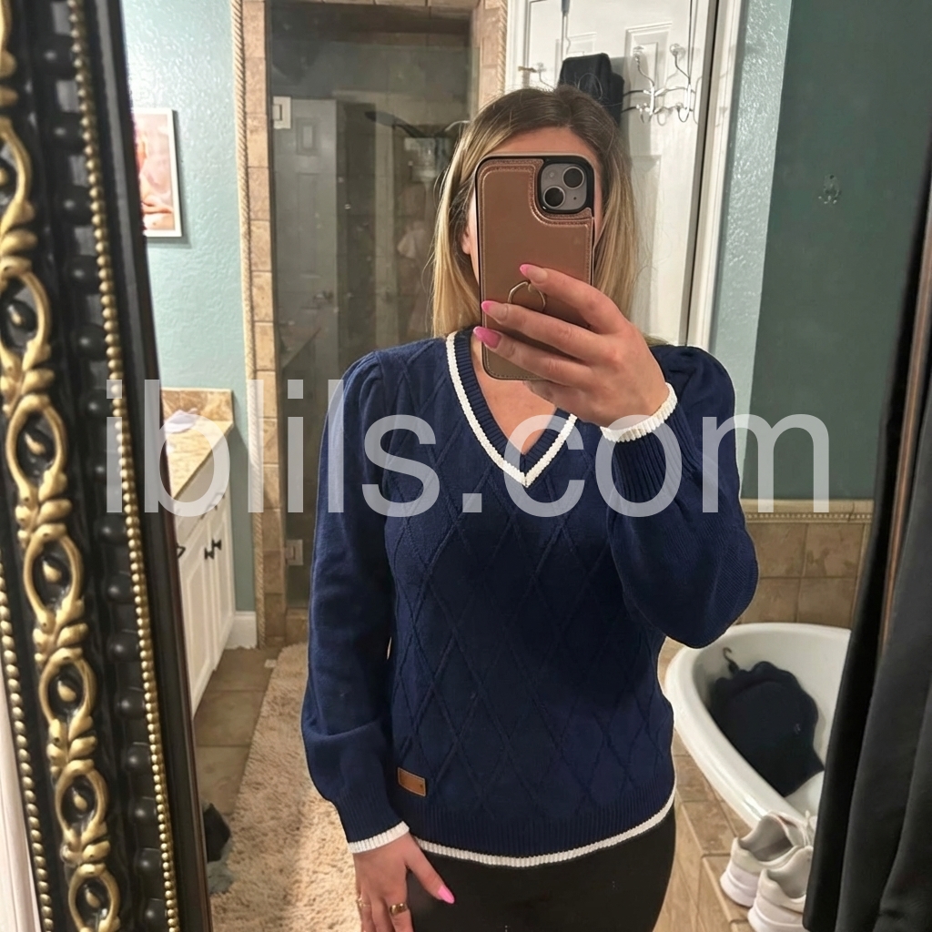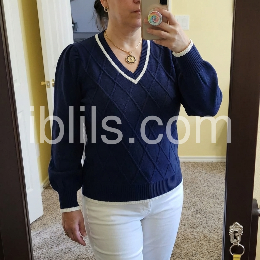 I’m obsessed with this chic navy sweater! The textured diamond pattern elevates it way beyond basic tops, and the contrast white piping makes the design pop. I’ve worn it to the office with slacks and on weekends with jeans—it’s versatile enough for every occasion, and it’s quickly become my go-to fall sweater!