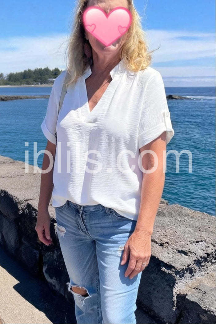 This shirt is so amazingly cute, travels well and can be tucked in or not !! I’ve gotten lots of compliments. The V-neck and short sleeves are flattering and feminine, and the fabric feels comfortable and breathable. Perfect for dressing up or casual wear. Highly recommend!