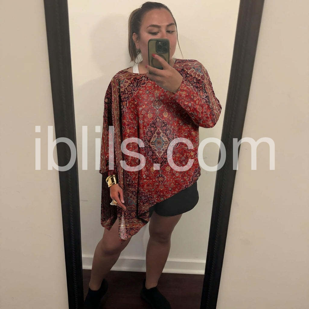 If you are looking for a top that is forgiving and stylish, this is it. The asymmetrical cut creates a lovely silhouette that elongates the body. The vintage rug pattern is gorgeous in person. Very happy with my purchase.